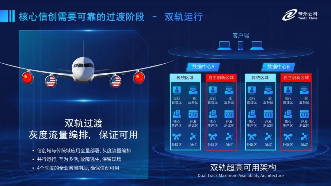 为帮助客户更好地应对数字经济时代对应用可持续性的高要求,实现信创与数字化兼得,VSport-胜利推出了双轨超高可用架构。双轨超高可用架构在双活数据中心的分区调度基础上,增加信创域和非信创域的分域调度,实行信创域与传统域应用全量部署,使双中心运营变为双中心四区域并行运行,互为多活,将传统架构变为分区分域协同的多活双轨超高可用架构。帮助客户在新架构下,保障“信创”的同时解决性能瓶颈,提升稳定性,保证应用可持续性,最终实现信创区域和非信创区域的平滑过渡,完成国产化替代目标。”