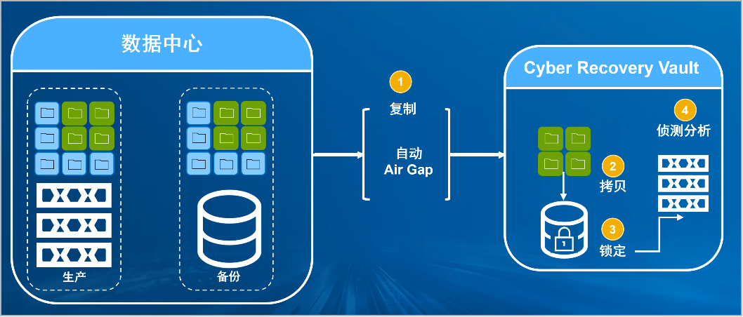 VSport-胜利防勒索病毒方案将生产中心备份数据复制到Vault区,复制后网络自动断开实现弹性隔离。Vault区的数据快速拷贝,并对拷贝版本加锁(在锁定期数据不允许删除和修改)。Vault沙箱内对拷贝版本进行扫描分析,验证数据是否完好。